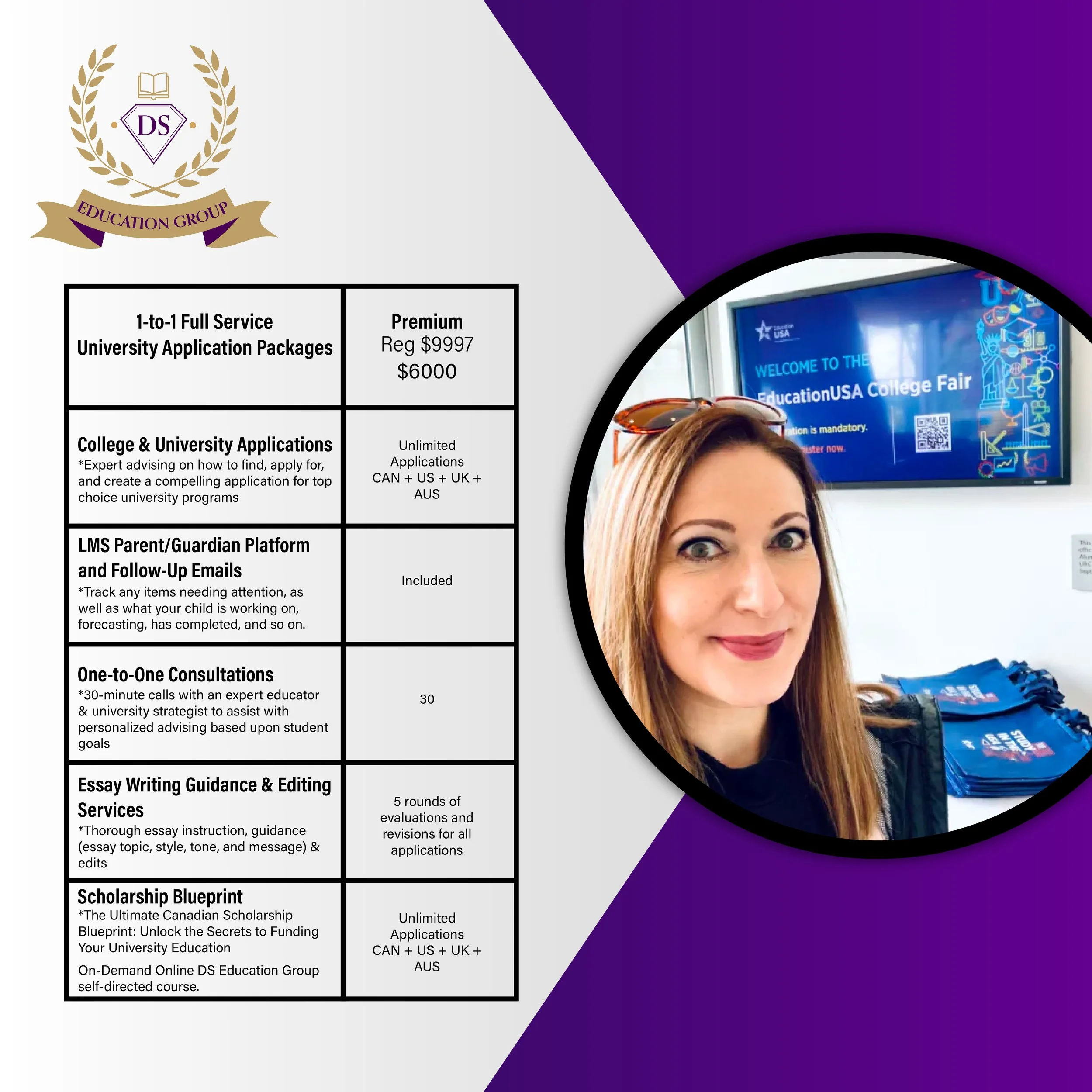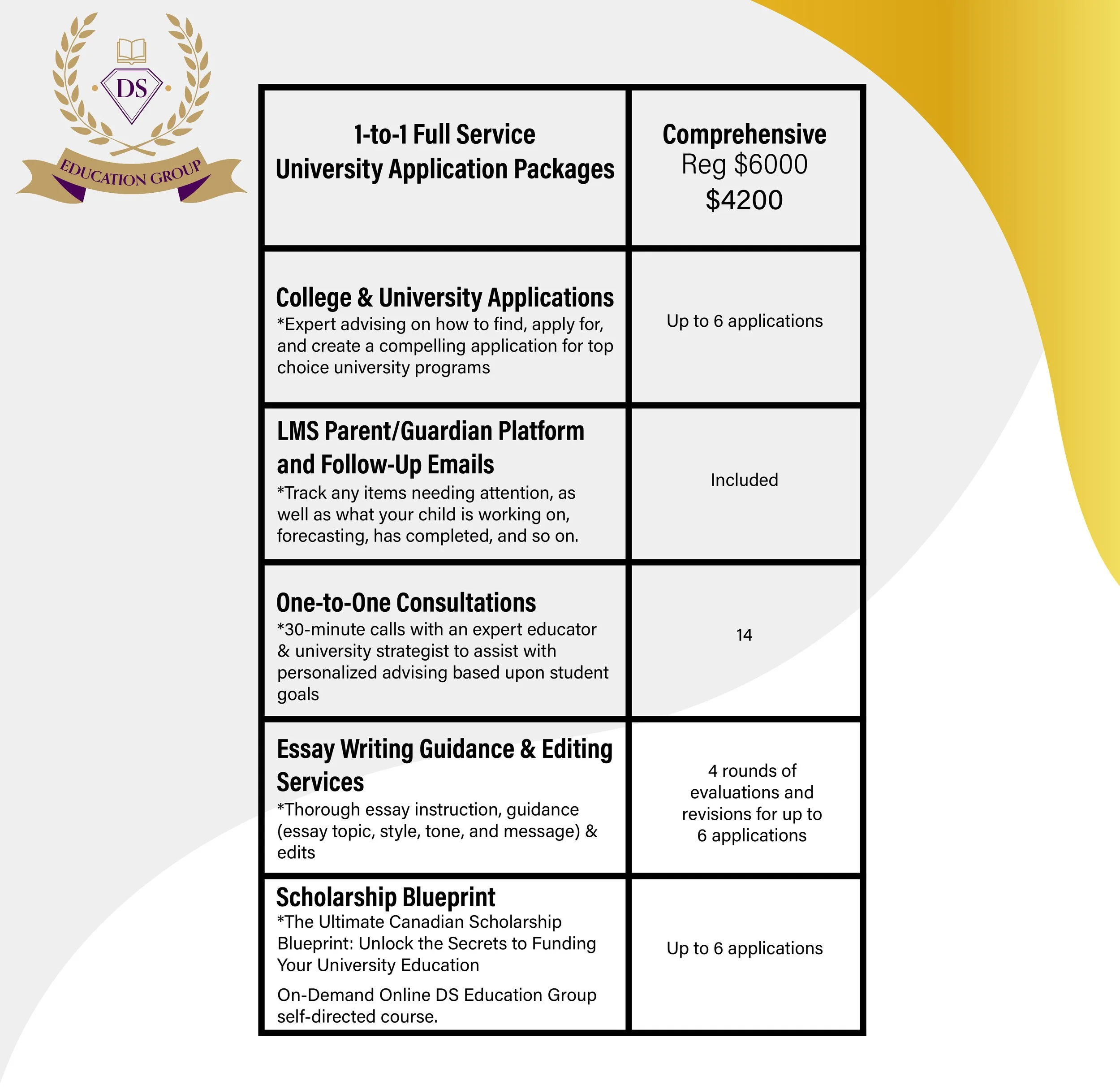 University Application Packages 1-1 Full Service University "Premium" Application Package CA$6,000.00 1-1 Full Service University "Comprehensive" Application Package CA$4,200.00 1-1 Full Service University "Prep" Application Package CA$2,997.00